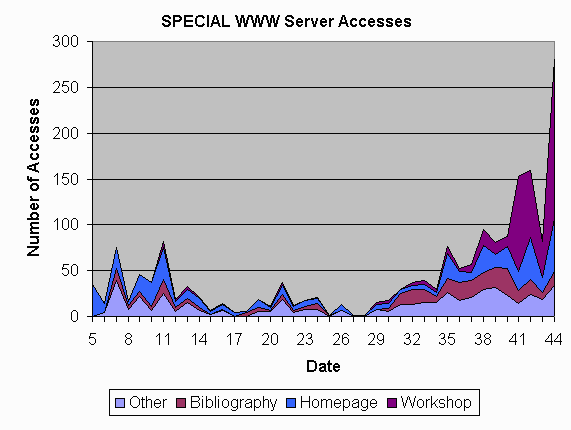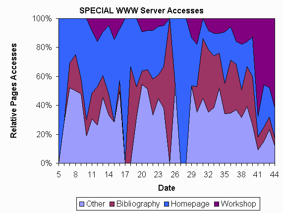 The following statistics was generated for the workshop of SPECIAL in Germany. It covers the calendar weeks 5 to 44 inclusive. In total, accesses to the frontpage ("homepage") were 31% of the total number of accesses (1469), to the bibliography page 19%, to the pages related to the workshop 18%, and to all other pages 32%. The upper panel depicts the accesses to these four groups in absolute numbers while the lower panel shows the same in per cent of total accesses. In both diagrams the data is plotted as a function of calendar weeks. Note, that search engines and other WWW crawlers were filtered out beforehand; the numbers represent "real" accesses by humans.