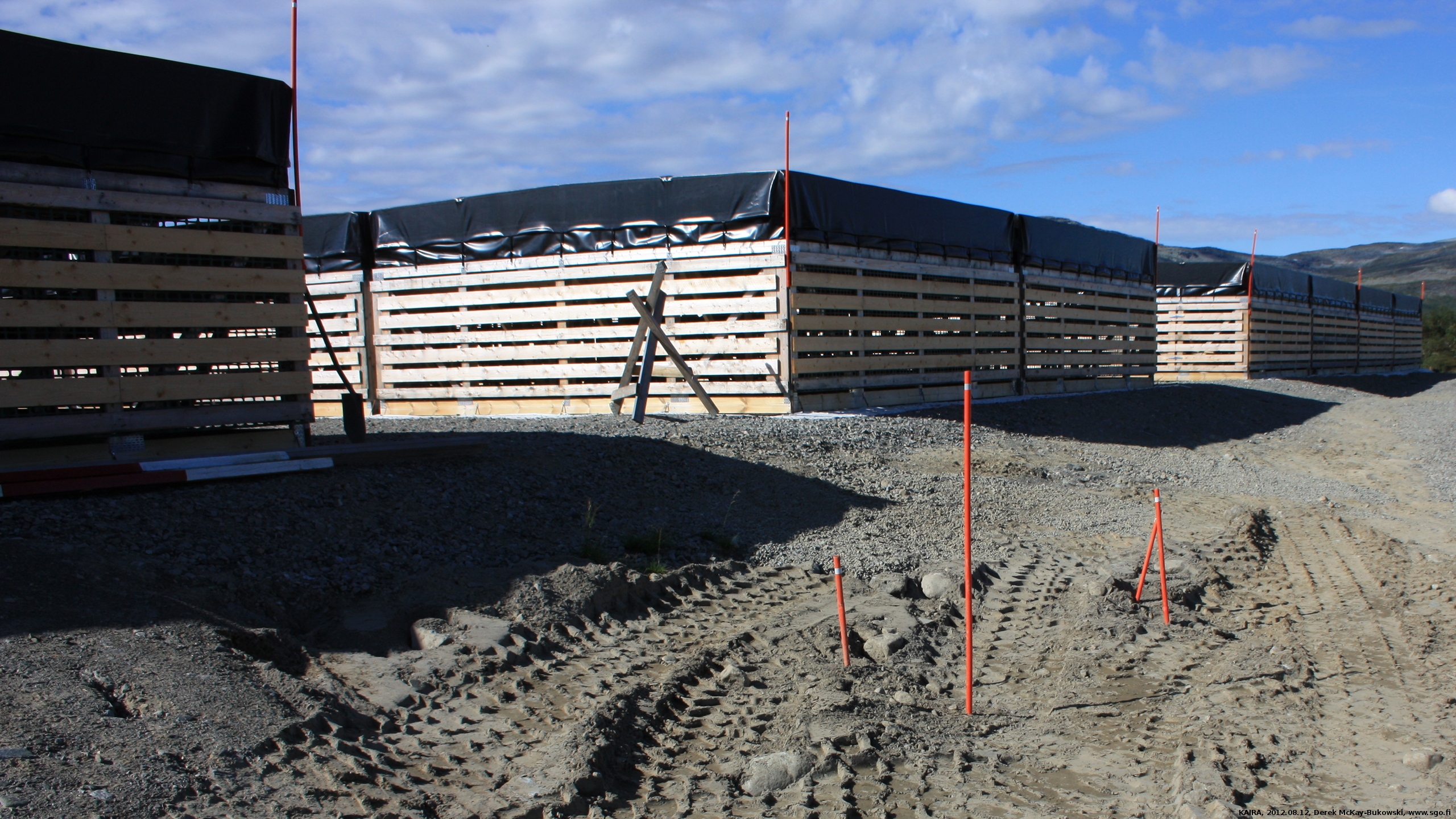 2012-08-12 Snow-and-wind panels have been installed on the sides of the High-Band Antenna (HBA) array. These slow down air-flow under the tiles, but still allow some degree of circulation. Robustness against snow/ice and wind is an important consideration. Credit: "Photo: www.sgo.fi" or "Photo: Sodankylä Geophysical Observatory, Finland" |