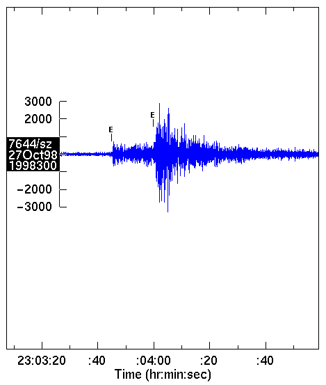 - Origin time (GMT): Oct 27 1998 23:03:24.7: Local time Oct 28 1998