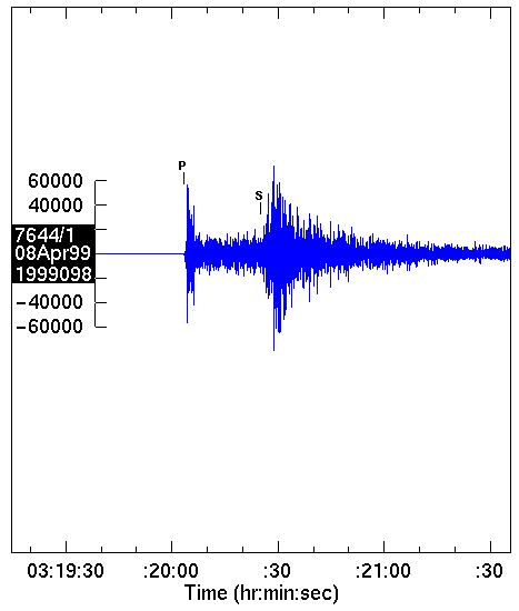 - Origin time (GMT): Apr 08 1999 03:19:33.2: Local time Apr 08 1999